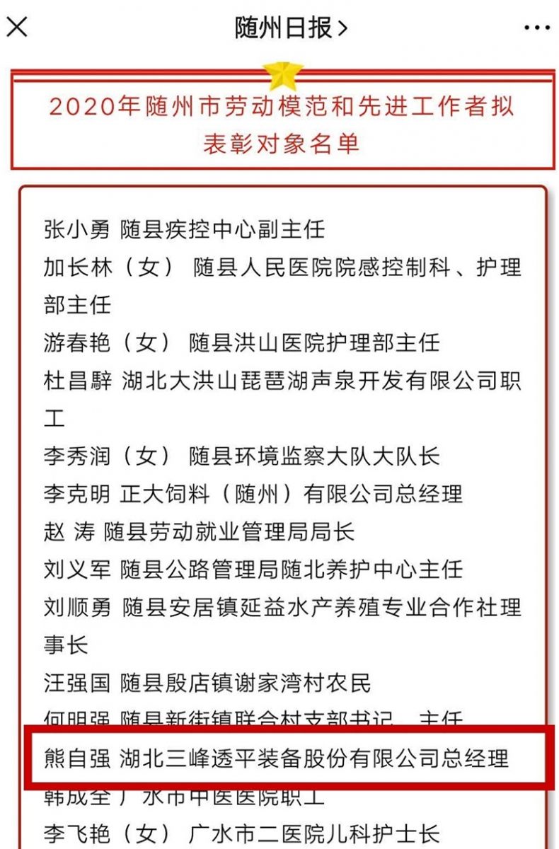 根據(jù)隨州市總工會《關(guān)于做好2020年隨州市勞動模范和先進(jìn)工作者推薦評選工作通知》精神及評選推薦要求,經(jīng)市委、市政府同意,確定了88名隨州市勞動模范和先進(jìn)工作者表彰對象,其中企業(yè)負(fù)責(zé)人15名。